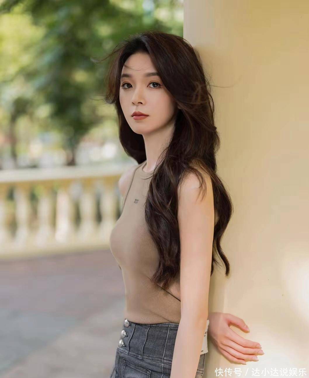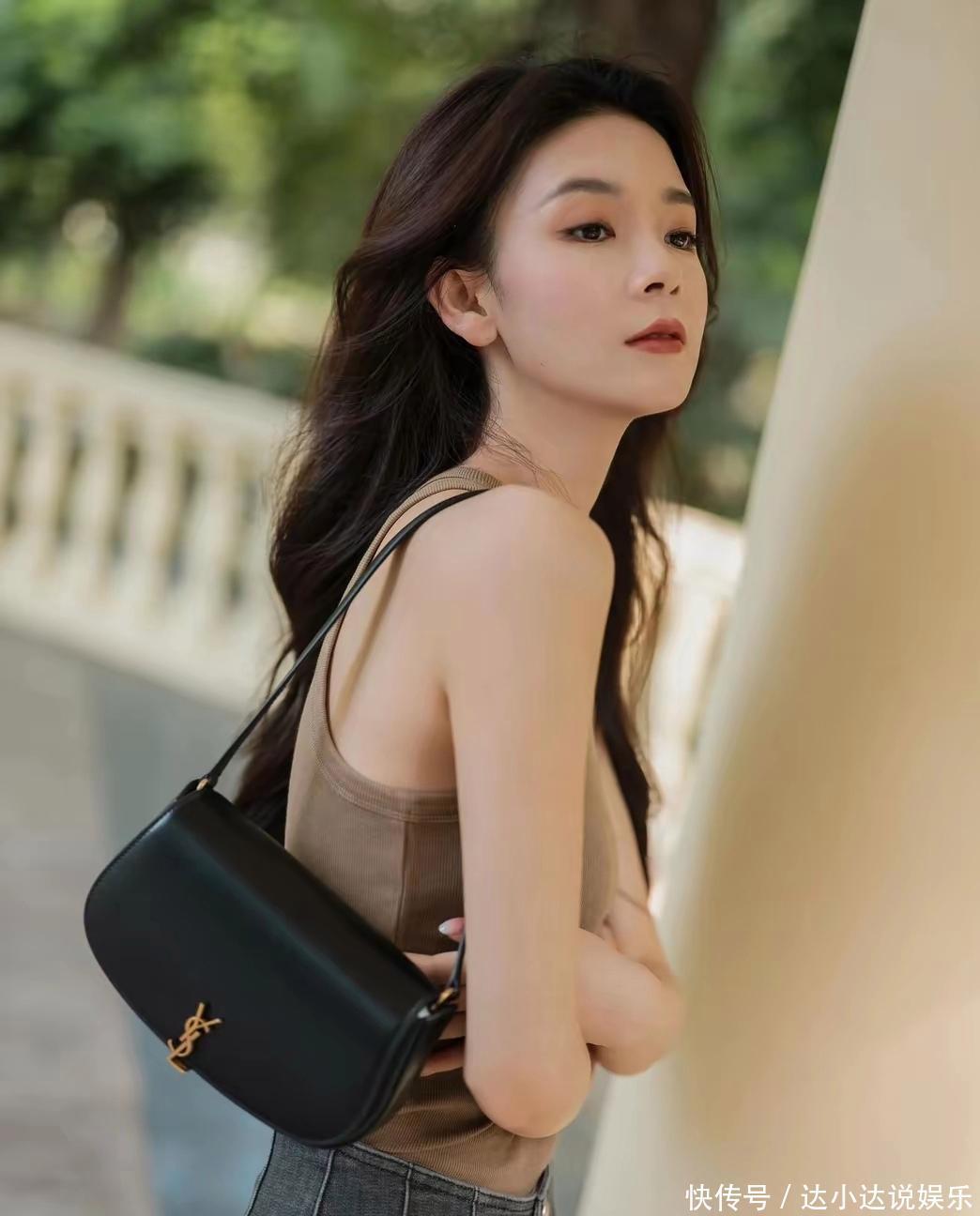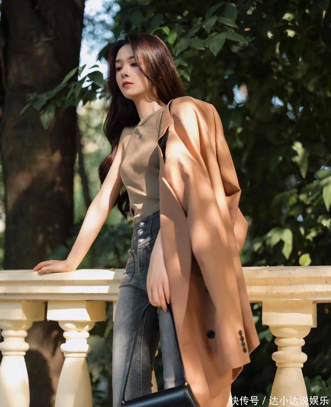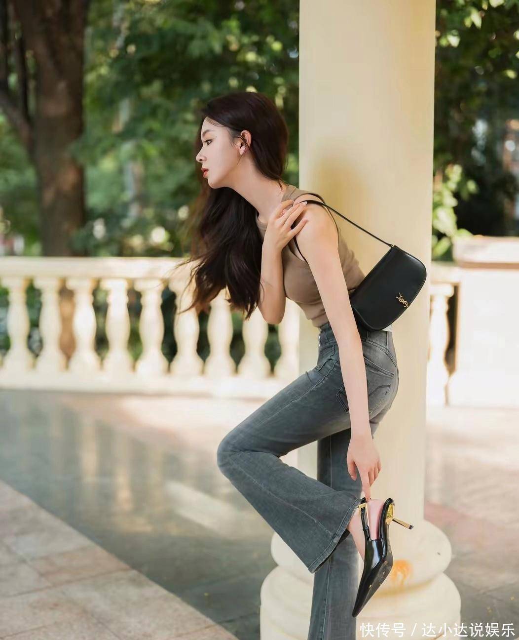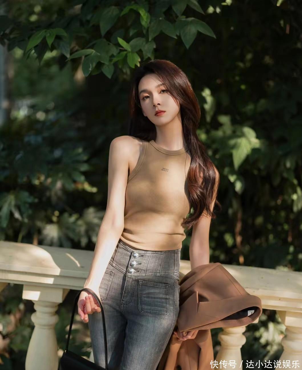 这组照片中,陈瑶选择了一款高腰微喇牛仔裤。这种裤型巧妙地修饰了腿型,既展现了腿部的修长,又增添了几分复古的韵味。搭配上一件简约的驼色无袖背心,整体造型简洁而不失时尚感。驼色与牛仔蓝的碰撞,营造出一种和谐而又别致的色彩搭配,凸显了她优雅的气质。