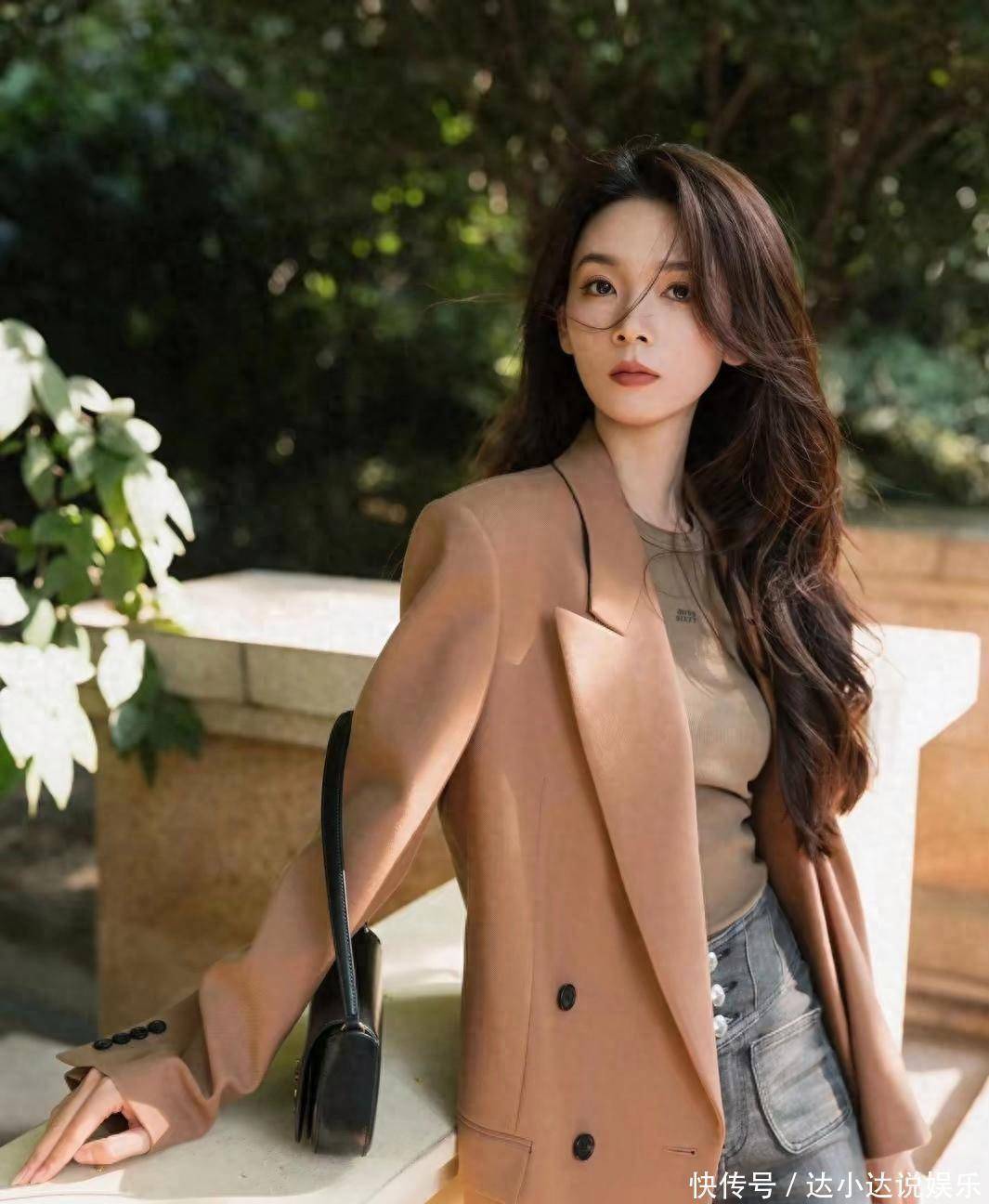 而外套的选择更是点睛之笔。一件宽松的驼色西装外套随意地搭在肩上,不仅在色彩上与背心相呼应,更增添了一份随性与大气。手中的黑色YSL腋下包,精致而时尚,为整个造型注入了现代都市的时尚元素。脚上的黑色尖头高跟鞋,进一步拉长了腿部线条,使她的身姿更加挺拔优雅。
